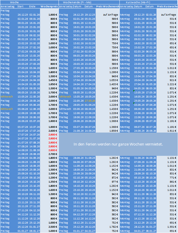 Nachfolgend befindet sich unsere aktuelle Preisliste. Die Preise sind wochengenau angegeben und zeigen die Preise jeweils für eine ganze Woche (Freitag bis Freitag), eine Kurzwoche
